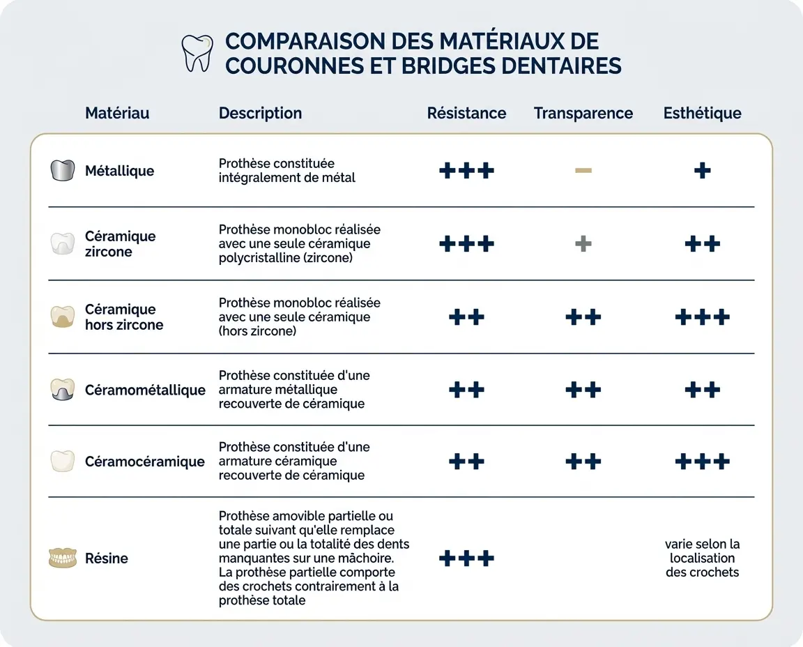 Tous les matériaux ne répondent pas au même objectif. Le bon choix dépend de la résistance recherchée, de la zone concernée, du niveau d’exigence esthétique, du contexte bucco-dentaire et du budget global du traitement.